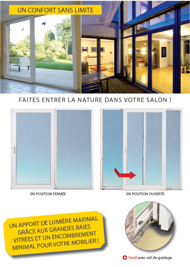 Ouverture Coulissante : principe d’ouverture par translation (déplacement latéral) du ou des ouvrants.