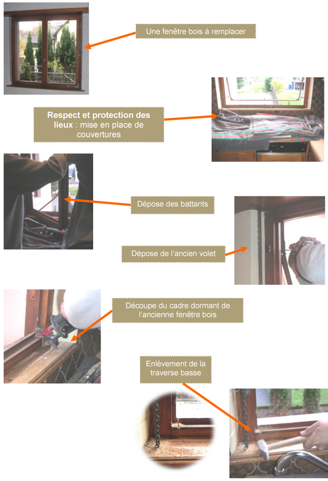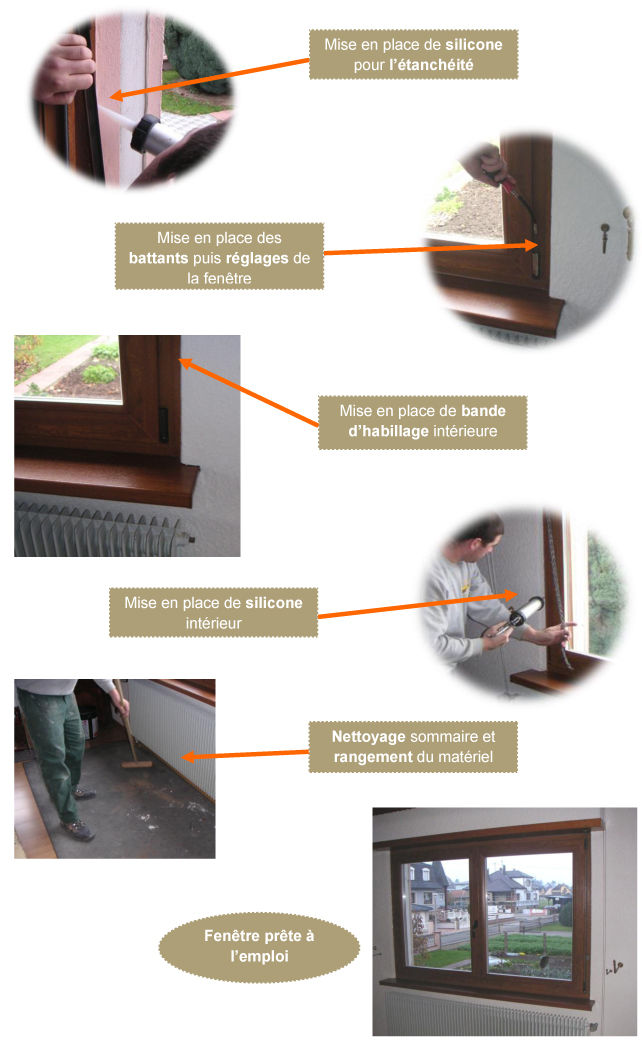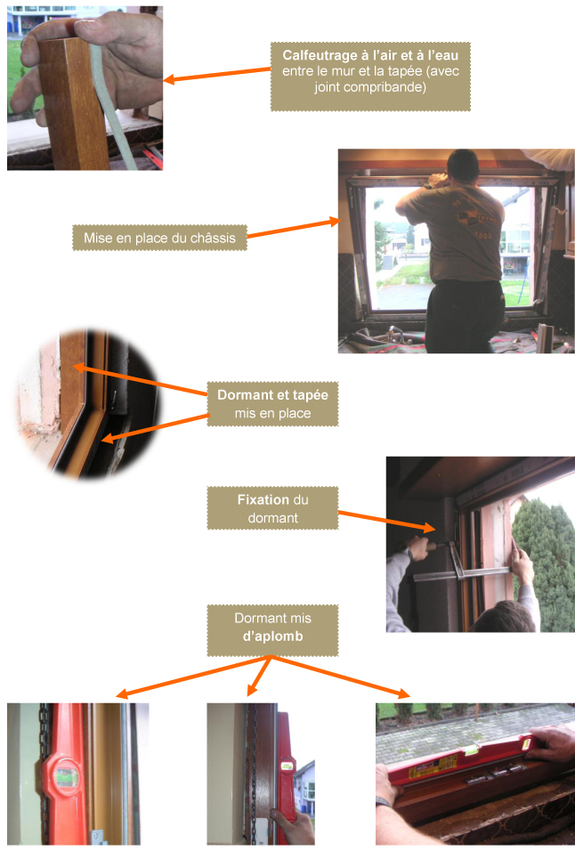 Pose en applique : Pose au nu intérieur avec une partie du dormant appuyée contre le mur. Pose traditionnelle en construction neuve en France. Nécessite la mise en place de dormants larges ou de tapées pour reprendre l’épaisseur du doublage d’isolation intérieure.