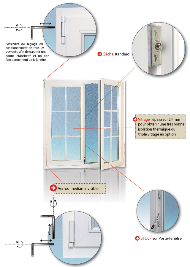 Ouverture à la française : Principe d’ouverture vers l’intérieur des ouvrants sur un axe de rotation vertical (système d’ouverture le plus courant en France).