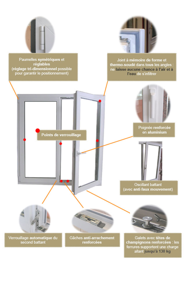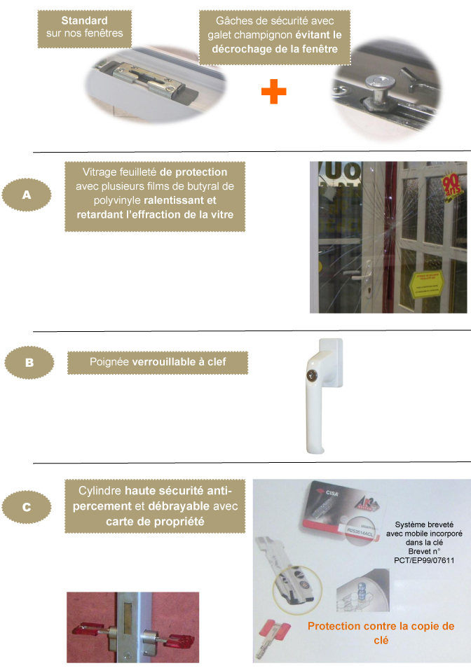 La combinaison des profilés à forte épaisseur et à géométrie optimisée pour un maximum de résistance, avec des vitrages et des quincailleries adaptés offre des performances sécuritaires optimales.