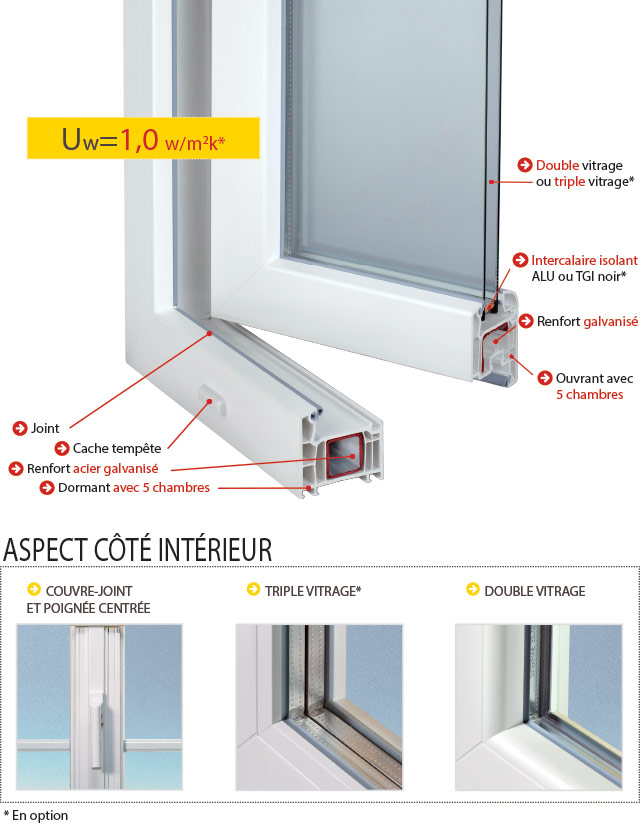 Des profilés jusqu’à 5 chambres, offrant un maximum d’isolation thermique. Des zones et des limites de renforcements spécialement étudiées pour limiter les ponts thermiques et garantir une performance optimale : Uw jusqu’à 1.0 W/m².K. Des feuillures à vitrage de 54.5 mm de large pouvant accepter tous types de vitrages y compris les triples vitrages.