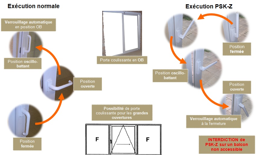Ouverture Coulissante à frappe : principe d’ouverture combinant une ouverture à soufflet puis une ouverture par déboîtement et par translation (déplacement latéral) d’un ouvrant. Appelée aussi « oscillo-coulissante ».