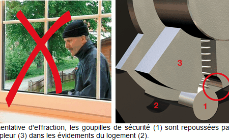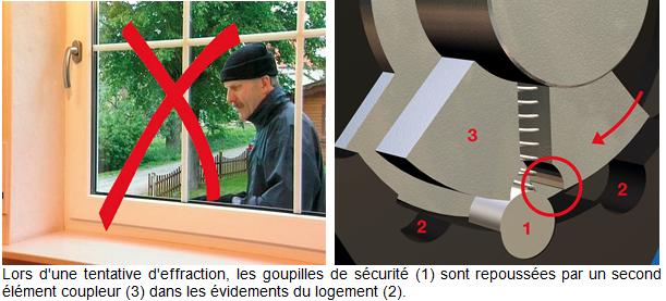 Dans cette position, les goupilles de sécurité (1) empêchent efficacement la rotation de la poignée de fenêtre à partir de l'extérieur. La poignée de fenêtre se verrouille et déjoue la tentative d'effraction.