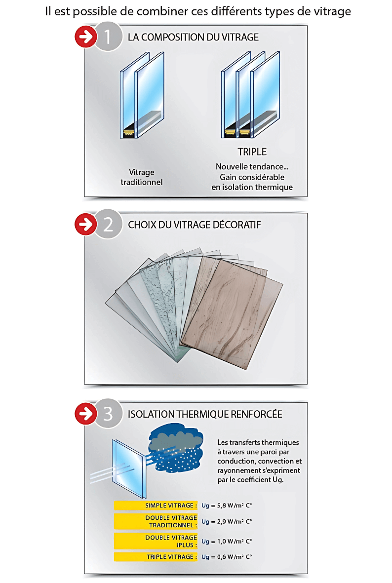 Vitrage (v.a. : ensemble verrier, double vitrage, triple vitrage) : mot désignant la partie transparente ou translucide de la menuiserie.