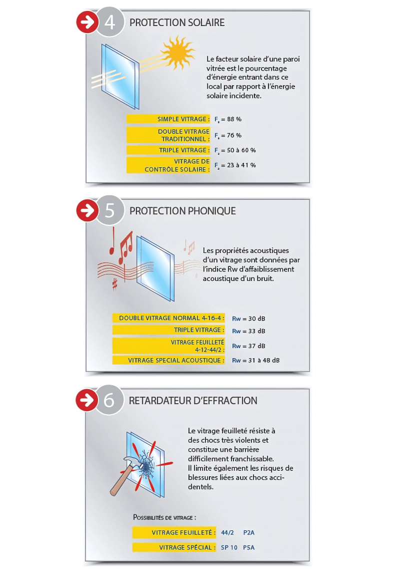 En cas de dégradation, les bris de verre adhèrent au film qui lui ne peut être que très difficilement découpé. le nombre de couches de verres et de films est variable suivant le degré de protection souhaité Il est ainsi possible de déterminer le type de menuiserie et de vitrage à mettre en œuvre en fonction des besoins individuels en matière de résistance aux agressions extérieures – protection contre l’envoi de projectiles à travers la vitre, protection anti-chute – mais aussi en fonction des exigences des compagnies d’assurances.